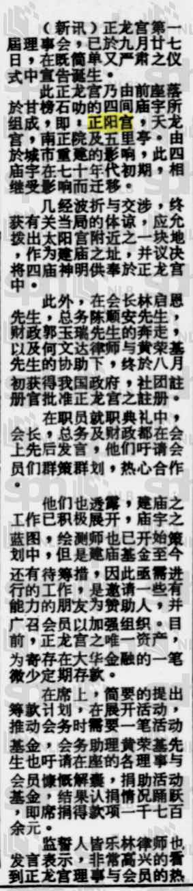 本宫新建庙宇经已竣工。本宫座落于甘榜石叻,系由过去龟仔山的正阳宫,万吉园的南正院、五里亭及天龙宫四庙所组成。本宫经订于农历丁卯年二月廿八日吉日、晚上八时,举行北极玄天上帝、如来佛祖、三娘佛祖、开山圣侯及诸佛神圣进神游境仪式,并订于三月初一日演线戏一日;三月初二、初三及初四日作清醮三天,祈求合境平安。为庆祝北极玄天上帝千秋圣诞,特聘新荣华潮剧团于初五及初六日上演酬神戏,祈求风调雨顺,国泰民安。